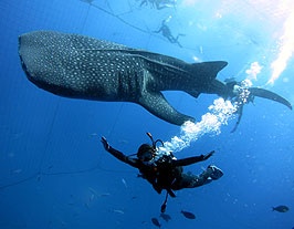 港の沖合い(約800m)にある生け簀に泳ぐ世界最大の魚「ジンベエザメ」が目の前で見れる大興奮、大迫力のツアーです。ジンベエザメはとっても大人しいので人に危害を加えることはありません!目の前で餌付けの様子も見れますよ!